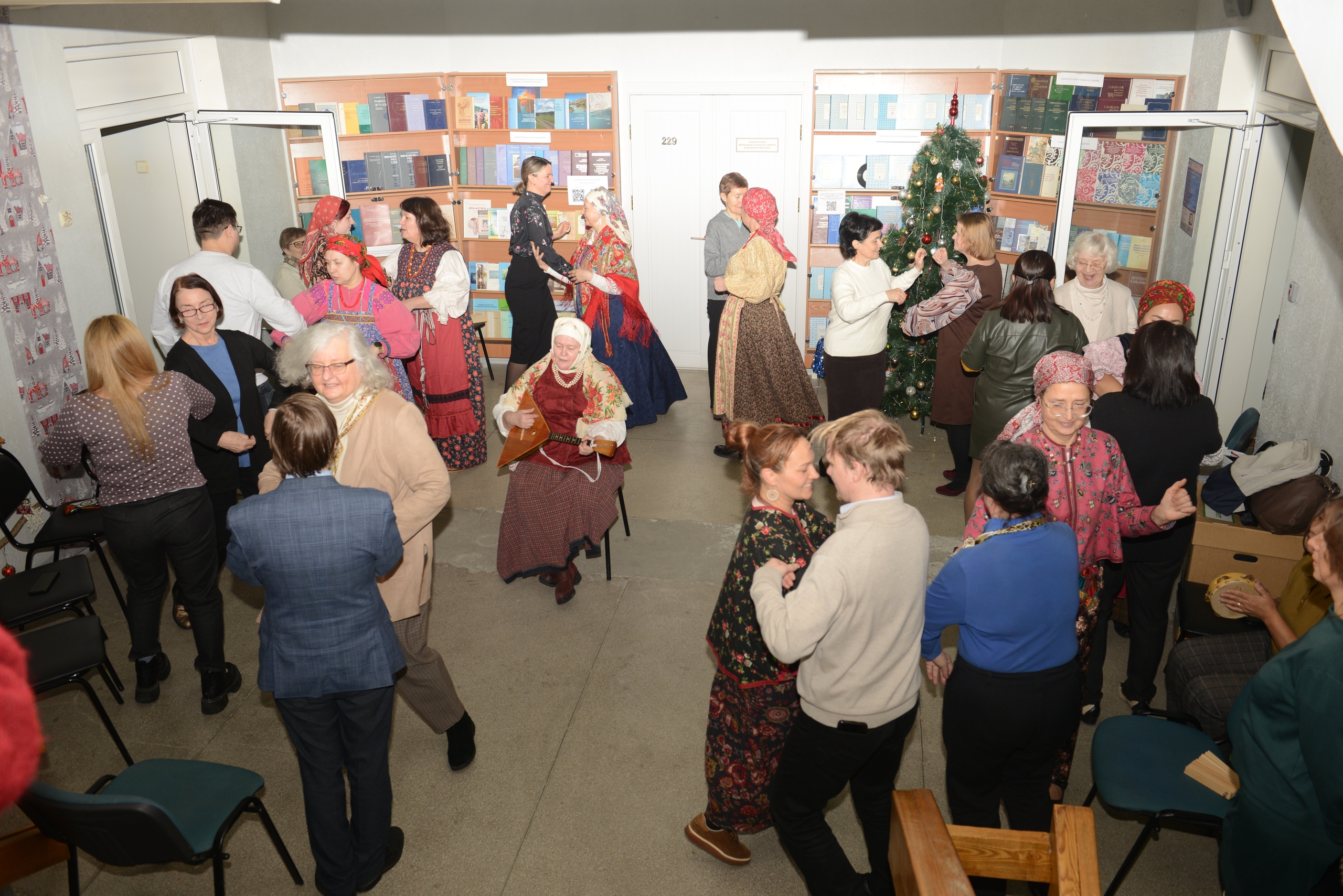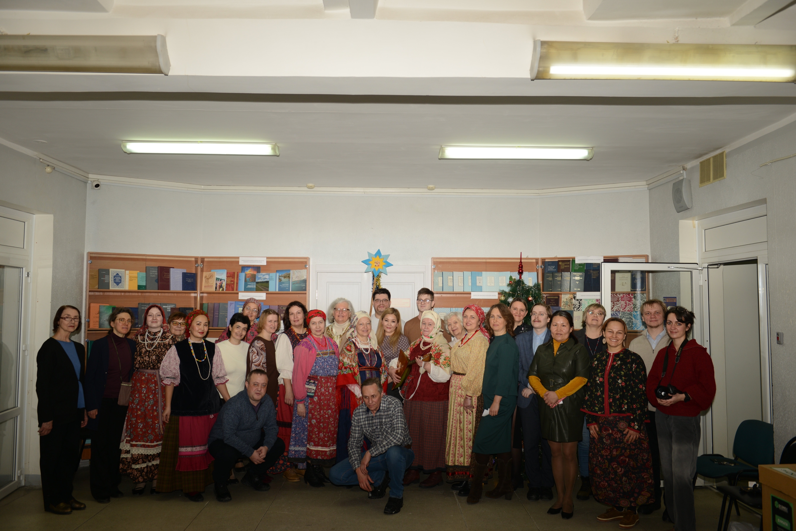 Сотрудники ИФЛ вживую познакомились с основными элементами святочных гуляний. Праздник начался с обхода кабинетов компанией колядовщиков, одетых в традиционные костюмы. В каждом «дворе» исполнялись колядки, щедровки, христославные песни, шуточные приговорки, записанные от славянских переселенцев в Сибири, в том числе в сёлах Новосибирской области. Хозяева кабинетов щедро одаривали колядовщиков едой, сладостями и деньгами, что, по традиционным представлениям, должно обеспечить благополучие и достаток на весь предстоящий год. Затем состоялась святочная вечёрка, в которой приняли участие все желающие. Сотрудники института с помощью колядовщиков разучили и исполнили несколько вечёрочных песен, хороводов и танцев под аккомпанемент балалайки, приняли участие в традиционных играх, в которых продемонстрировали ловкость, смекалку, чувство юмора. Завершилась встреча общим чаепитием.