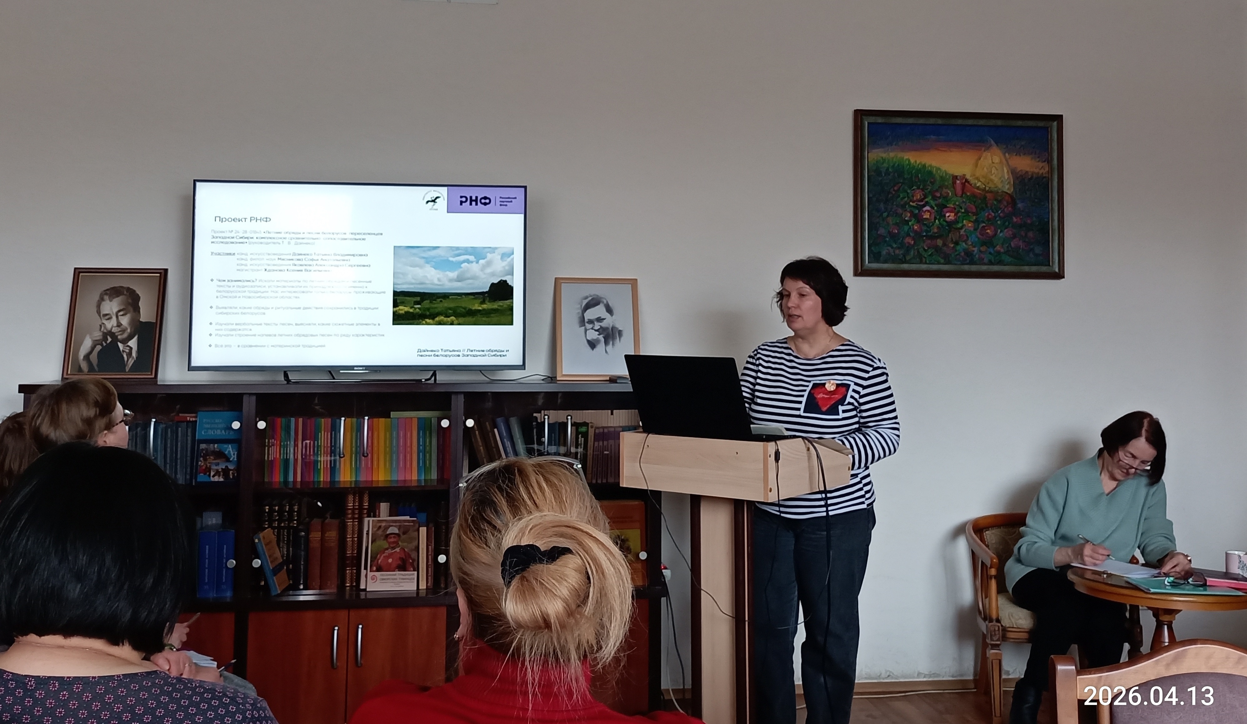Научный доклад «Летние обряды и песни белорусов-переселенцев Западной Сибири: комплексное сравнительно-сопоставительное исследование» прочла н. с., канд. иск. Т.В. Дайнеко (Проект 24-28-01845 «Летние обряды и песни белорусов-переселенцев Западной Сибири: комплексное сравнительно-сопоставительное исследование». Конкурс 2023 года (№ 89) «Проведение фундаментальных научных исследований и поисковых научных исследований малыми отдельными научными группами», 2024–2025 гг., руководитель канд. искусствоведения Т. В. Дайнеко).
