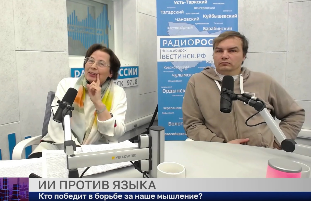 19 ноября 2025 г. в прямом эфире «Радио России» в рамках передачи «Есть мнение» с Петром Уваровым состоялась тематическая беседа «ИИ против языка» с главным научным сотрудником сектора русского языка в Сибири Института филологии СО РАН, доктором филологических наук, профессором Ириной Владимировной Шапошниковой и заведующим Лабораторией аналитики потоковых данных и машинного обучения Новосибирского государственного университета, кандидатом физико-математических наук Евгением Николаевичем Павловским.