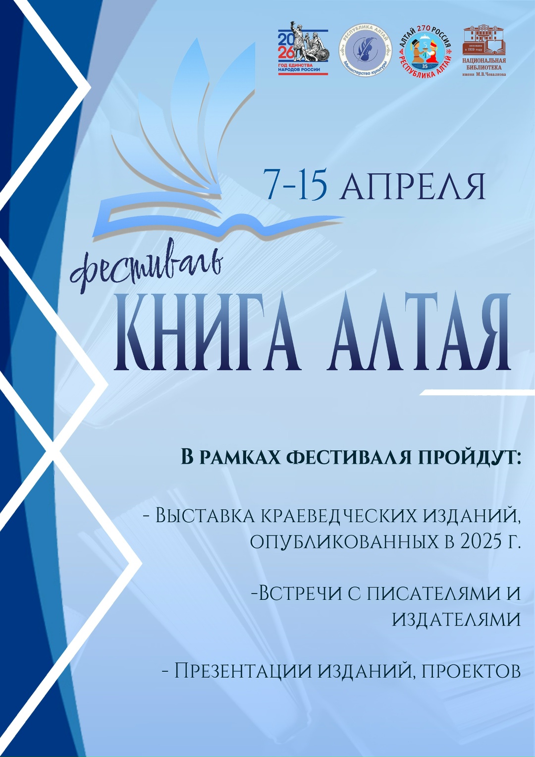 Фестиваль «Книга Алтая» – ежегодное мероприятие, которое организует Национальная библиотека имени М.В. Чевалкова при поддержке РОО «Библиотечное общество Республики Алтай» с 2013 года. Среди постоянных участников фестиваля - НИИ алтаистики им. С.С. Суразакова, Горно-Алтайский государственный университет, Государственный архив Республики Алтай, Республиканский центр народного творчества. В 2026 году фестиваль проходил 7-15 апреля.