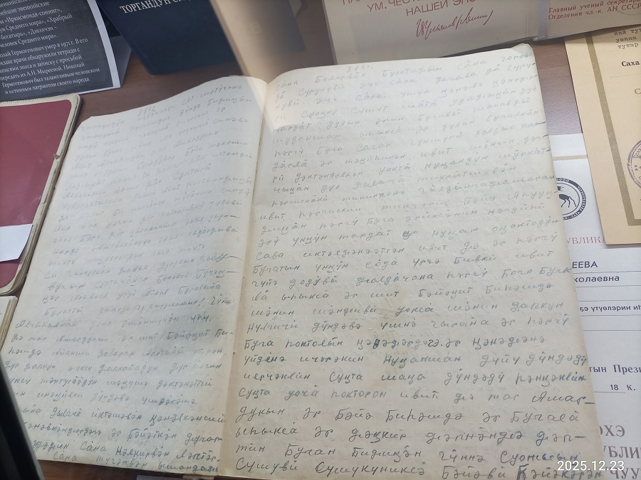 В рамках конференции в Музее истории науки Якутии им. Г.П. Башарина состоялось открытие выставки «Анна Николаевна Мыреева – ученый, просветитель, гуманист», на которой представлены уникальные документы и фотографии, связанные с деятельностью исследователя. Так, здесь экспонированы известные в фольклористическом мире рукописные тетради Николая Гермагеновича Трофимова – последнего эвенкийского сказителя. Тексты из этих тетрадей составили основу корпуса тома «Эвенкийские героические сказания», подготовленного Анной Николаевной Мыреевой и опубликованного в 1990 году в качестве первого тома серии «Памятники фольклора народов Сибири и Дальнего Востока» (с трагической историей уникальных рукописных тетрадей можно познакомиться в материале Дианы Хомяковой, опубликованном в «Науке в Сибири»). Интересна также фотография, запечатлевшая встречу Анны Николаевны с Александром Бадмаевичем Соктоевым, инициатором серии.