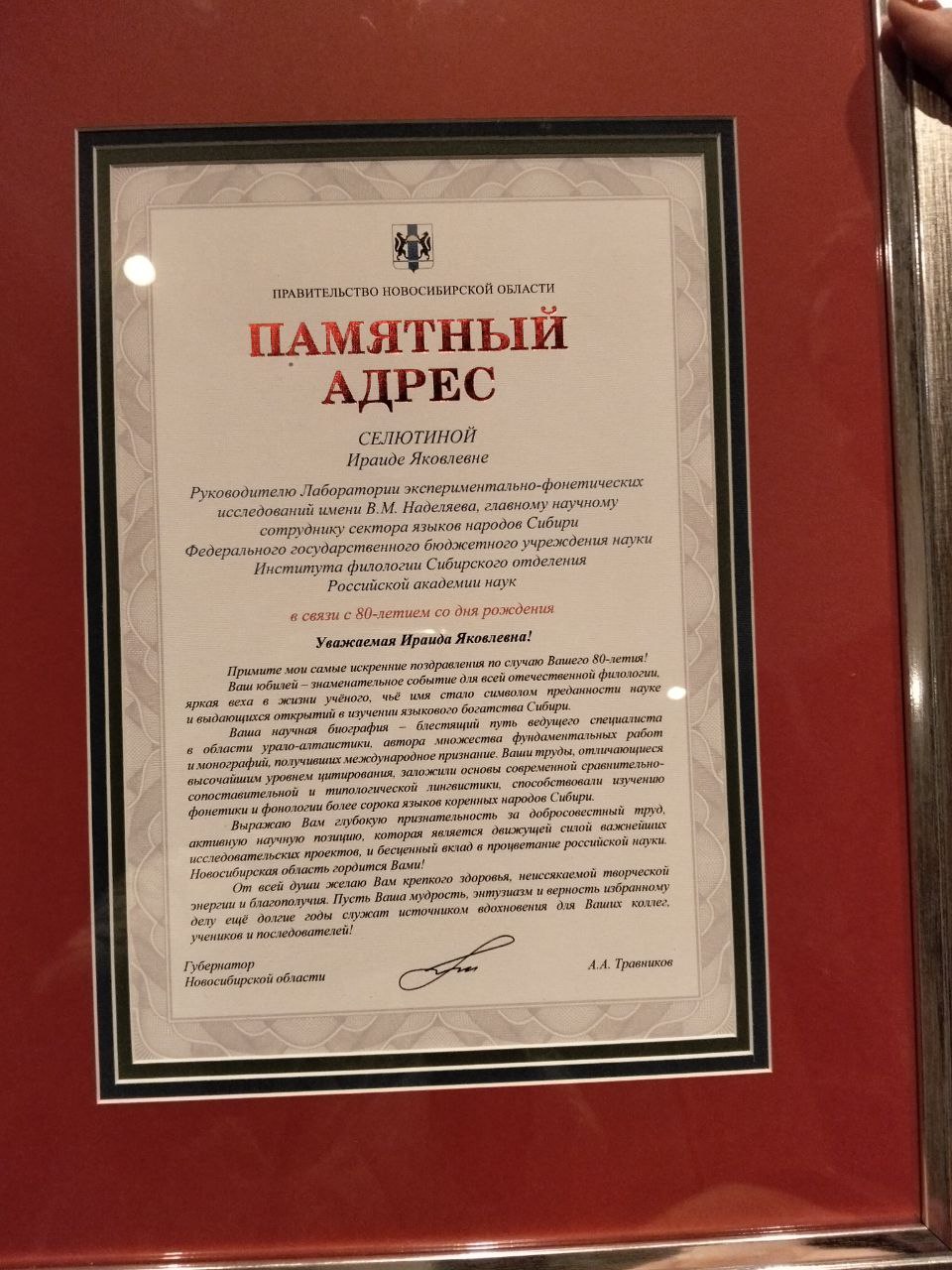 На церемонии поздравления памятный адрес Ираиде Яковлевне, подписанный губернатором Новосибирской области Андреем Александровичем Травниковым, вручил министр науки и инновационной политики Новосибирской области Вадим Витальевич Васильев.